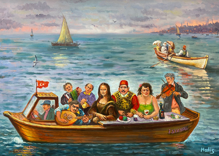 Karakurt’un bir tablosunda İstanbul Boğazı, akşamın son ışıklarıyla gümüşe dönüyor; Leonardo da Vinci’nin ikonik figürü Mona Lisa, fes takmış bir İstanbul beyefendisi, bir udî, bir kemancı ve birkaç neşeli müzisyen karakterle birlikte “İstanbul” yazılı bir teknede Boğaz’ın o gümüş sularında süzülüyor. Bu, hem batı sanat tarihine, hem de yerel kültüre yapılan mizahi bir selam. Burada Karakurt’un amacı, “yüksek sanat” ile “popüler kültür” arasındaki sınırları bulandırmak.