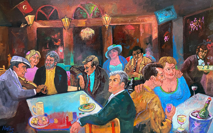 Bir başka tabloda ise, denize bakan uzun bir iskelede yere serilmiş halılar ve etrafında bir meze sofrası görülüyordu. Rakı şişesinin içinden süzülen ışık, suya karışıyor; gülüşen insanlar, yan yana ama biraz da birbirine uzak duruyor. Sanki her biri başka bir zamandan çağrılmış gibi. O masada yalnızca neşe değil, bir bekleyiş de var. Rengin ardında ince bir hüzün gizlenmişti sanki.