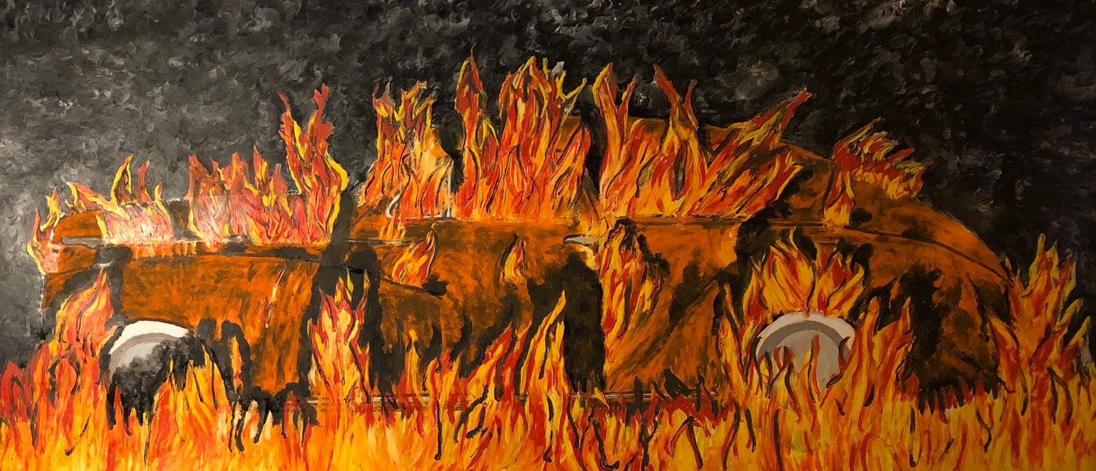 ARDEN’nin alev alev yanan dev tuvali; Dünya’nın toplumsal ekolojik yıkımın eşiğindeki paradoksunu, bütün eski değerlerin yıkılıp yeniden kurulması üzerine bir alegori. Sanatçının canındaki algılama yetisi bize kahinimsi bir mesaj veriyor. Şöyle diyor sanatçı; “Artık yanıyoruz, her şey kül olacak ve yeniden doğacağız”. Sanatçının tuvaldeki betimi bir algı resmi, sezgisel bir girişim, duyumsama anındaki estetik ifade. O bir yangını değil insanlığın 21 yüzyıl içinde nasıl tükendiği gösteriyor bize. Orta Çağlı Agrippa Von Netteshim “Görme ateşseldir” diyor. Ben de iç görme ateşseldir diyorum.