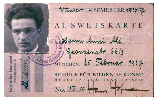 Georgen Strasse 66/3 adresinde ikamet eden Bay Avni Ali’nin (Çelebi). Münih Georgen Strasse 40 numara’da hizmet veren Hans Hofmann Güzel Sanatlar Okulu’na, 1926-1927 Kış Sömestrinde sanat öğrencisi olarak kayıt yaptırdığını belgeleyen, sol üst köşede yer alan vesikalık fotoğrafının altında Ali Avni olarak kişisel imzası bulunan, Hans Hofmann ıslak imzalı ve mühürlü resmi kimlik kartı Ali Çelebi’nin Hofmann Atölyesinde geçirdiği son yılının kimlik kartıdır.