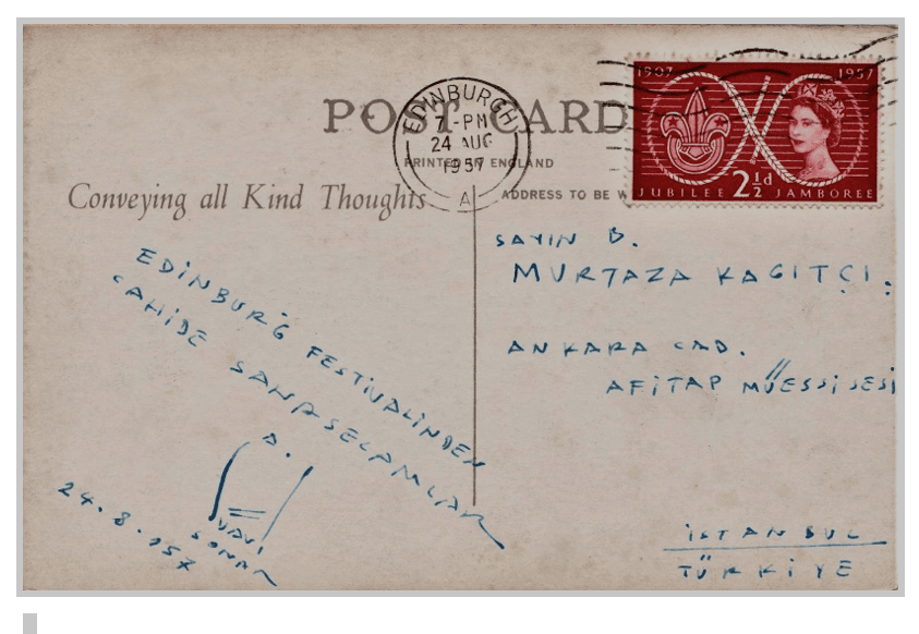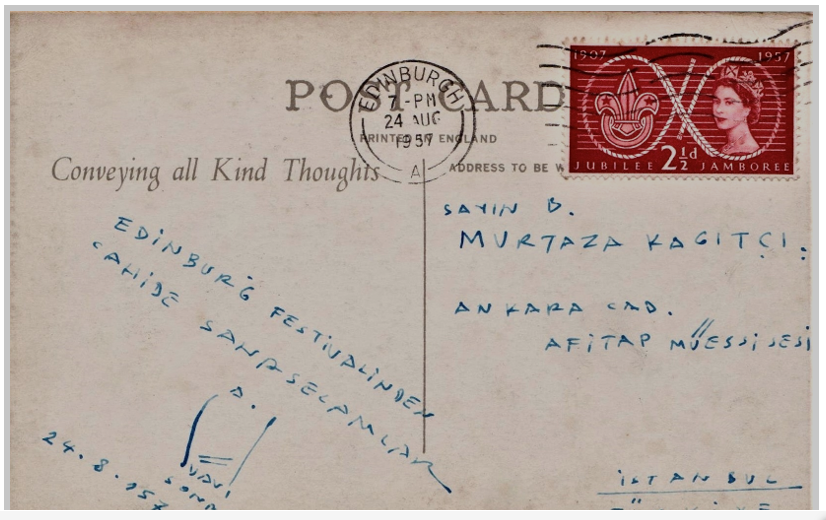 1957 yılının Ağustos ayında Edinburg’dan İstanbul’a, Cağaloğlu’nun o meşhur Afitap Müessesesi’nin sahibi kadim dostu Murtaza Kağıtçı’ya gönderilen bu kartpostal, basit bir selamdan çok daha fazlasıdır. Altındaki o tasarım şaheseri imza, Türkiye’nin yetiştirdiği en “dünyalı” sanatçılardan birine; Suavi Sonar’a aittir.