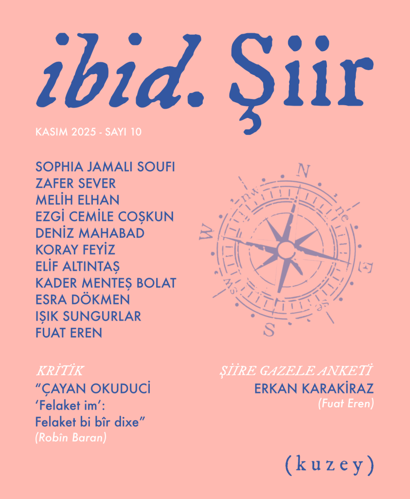 Genel yayın yönetmenliğini Ercan y Yılmaz’ın yaptığı veveya.net edebiyat sitesinin Fuat Eren ve Erkan Karakiraz tarafından yayına hazırlanan dijital şiir dergisi ibid. Şiir, 10. sayısında, “kuzey” sözcüğünün çoklu çağrışımları üzerine düşünüyor. “Kuzey”, kimileri için yön, yönlendirme, yuva, sığınak, varış noktası, sevgi, umut, ütopya iken kimileri için de sıla, uzak, soğuk, yabancı, sert rüzgârlar, nefret, distopya anlamlarına gelebiliyor. “Kuzey”in farklı disiplinlerden akla getirdiklerini derginin konuya ayrılmış sayfalarından okuyabilirsiniz.