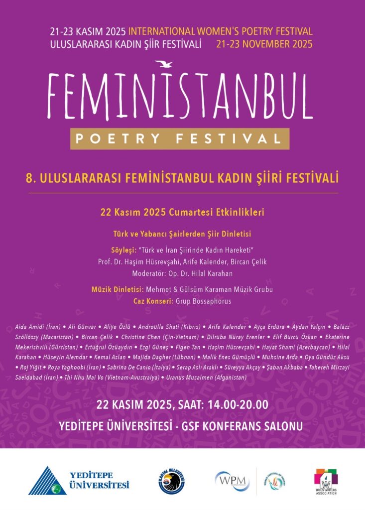 Uluslararası FeminİSTANBUL Kadın Şiiri Festivali’nin ikinci gününde dünya şairleri Yeditepe Üniversitesi’nde buluşup kendi dillerinde şiirler okuyacak. Şiirlerin ardından “Türk ve İran Şiirinde Kadın Hareketi” isimli söyleşi olacak, konuşmacılar Prof. Dr. Haşim Hüsrevşahi, Arife Kalender, Bircan Çelik; moderatör Op. Dr. Hilal Karahan. Şiirlere Mehmet & Gülsüm Karaman Müzik Grubu söz ve vokalle eşlik edecek. Program Grup Bossaphorus Caz Konseri ile bitecek. Günün moderatörleri Dilruba Nuray Erenler ve Ayça Erdura.