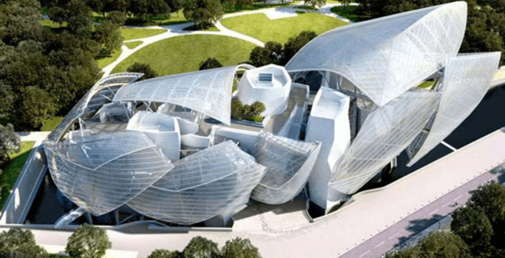 Her bir adımda yaklaşırken bugüne kadar görmediğiniz biçimde bir binayla rastlaşıyordunuz. 12 devasa cam eğrisi çatılardan oluşan bu bina her attığınız adımda şekil değiştiriyordu. Balina, uzaydan düşen meteor, örümcek kozası veya büyük bir bulut biçimlerini andıran bu yapı dört bir yanındaki Boulogne ormanının ağaçlarının binanın devasa camlarında yansımasıyla, günün saatine bağlı olarak değişen ışığın açısıyla çeşitli görüntüler vermekteydi.
