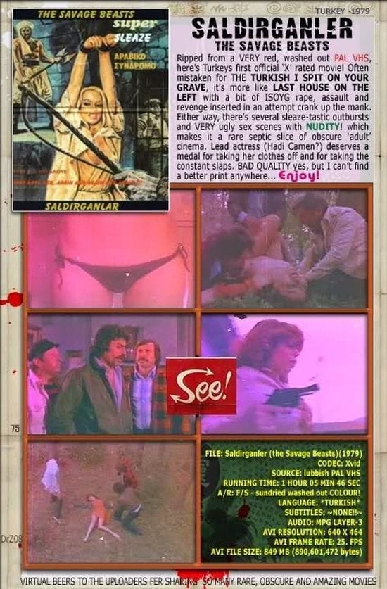 Daha sonra Korkunç İntikam adıyla videosu çıkmış olsa da I Spit on Your Grave’in ülkemizde sinemalarda vizyona girdiğini gösterecek ne bir afişe ne lobi kartına ne de gazete ilanına şimdiye dek rastlamadım ama İntikam Kadını (1979) adlı bir Yeşilçam filmi konusu itibariyle I Spit on Your Grave’den esinlenmişe bir hayli benziyor ve nitekim İntikam Kadını’nın bir video kaydından türetilmiş korsan DVD’leri yurtdışında “Turkish I Spit on Your Grave” diye lanse ediliyordu!… Yurtdışındaki istismar filmleri meraklıları arasında- İntikam Kadını’na oranla daha sınırlı tanınırlık kazanmış olmakla birlikte- tecavüz-intikam janrıyla ve bu janrdaki bir başka Amerikan filmiyle ilişkilendirilerek lanse edilen bir diğer düşük bütçeli Yeşilçam yapımı ise Saldırganlar (1979).