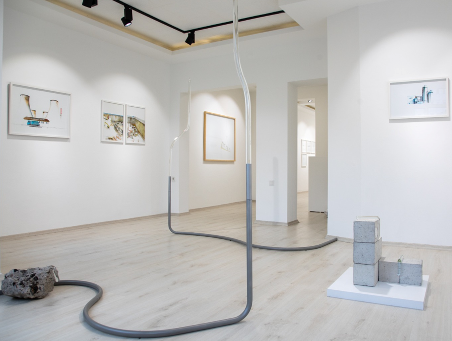 Stela Vasileva’nın Construction Time sergisi yalnızca duvarda asılı işlerden oluşmuyor. Küratör Fırat Arapoğlu, sergiyi bir kat planı gibi değil, bir rota gibi kurgulamış. Daha girişte apartmanın zemin katında karşılaştığınız uzun ölçekli heykel, gelen ziyaretçileri aşağıdan yukarı doğru düşünmeye zorluyor. Metal ve camdan oluşan, şeffaf hortumu andıran heykelimsi bu form, hem akışkan hem de dirençli bir yapıda.