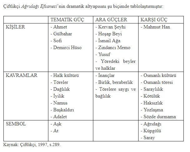 “Benim yarı efsane, yarı gerçeği anlatma yolunda bir tutkum var. Ağrı Dağı Efsanesi’nde bunu daha çok yoğunlaştırdım. Ben iki büyük gücün sonsuz yaratıcılığına inanıyorum. Biri doğa, biri halk. Gücüm yettiğince bu romanda, bu iki büyük gücü bir araya getirdim. Halk gücü bir araya gelince, onun karşısında hiçbir gücün duramayacağını anlatmaya çalıştım. İnsan soyu tarih boyunca tiranizmi yaşamıştır. Yani büyük tiranların zulmü altında yaşamıştır. Ama halk zulme karşı, hangi çağda olursa olsun savaşmıştır. Ve savaşa hazır olmuştur. Bu romanın ana temalarından biri de bu oldu. (…)” (Çiftlikçi, 1997, s.280).